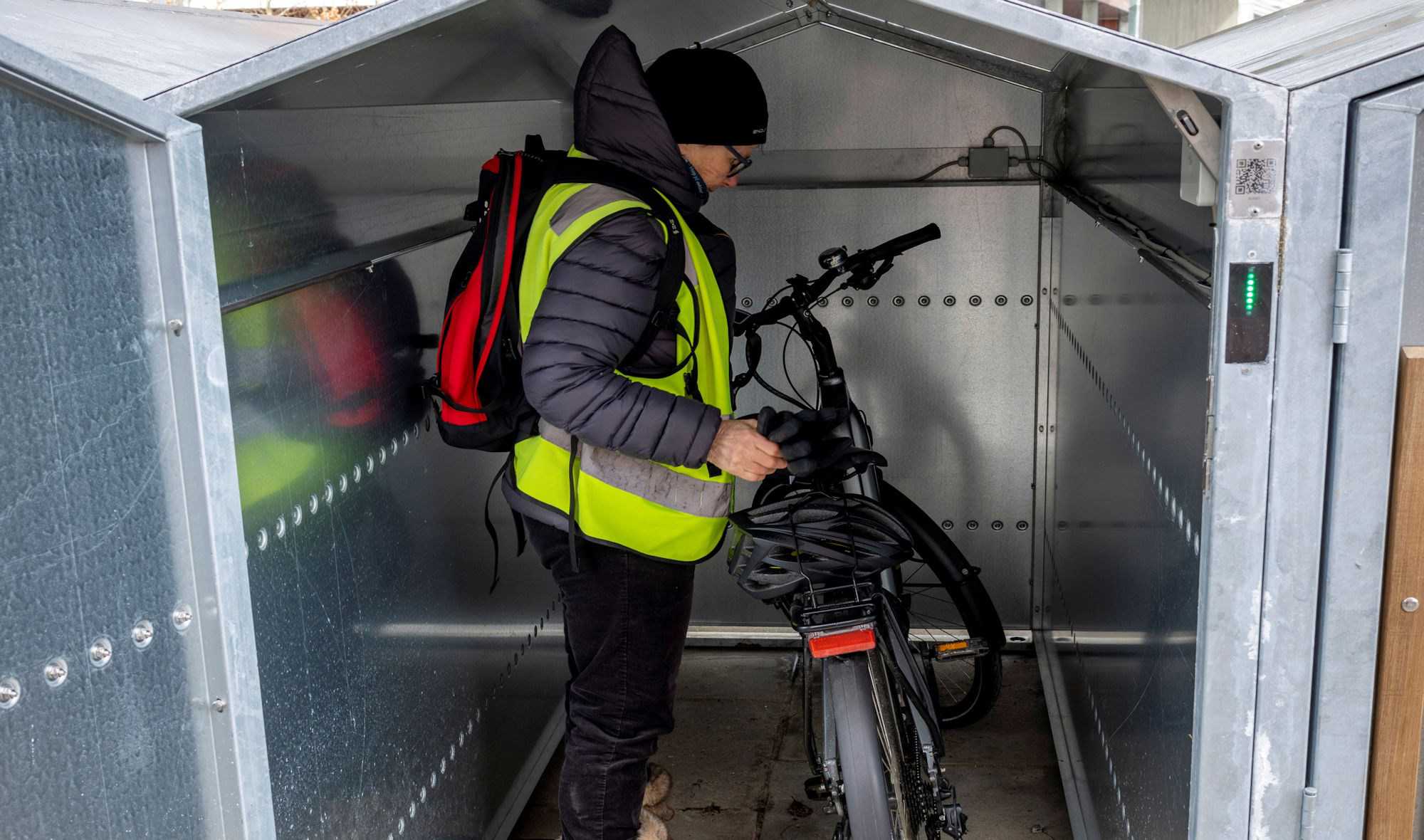 Tyverisikker cykelparkering med mulighed for at oplade el-cykel og bruge en bagageboks til cykelhjelm, batteri m.m. Alt er gratis at bruge.