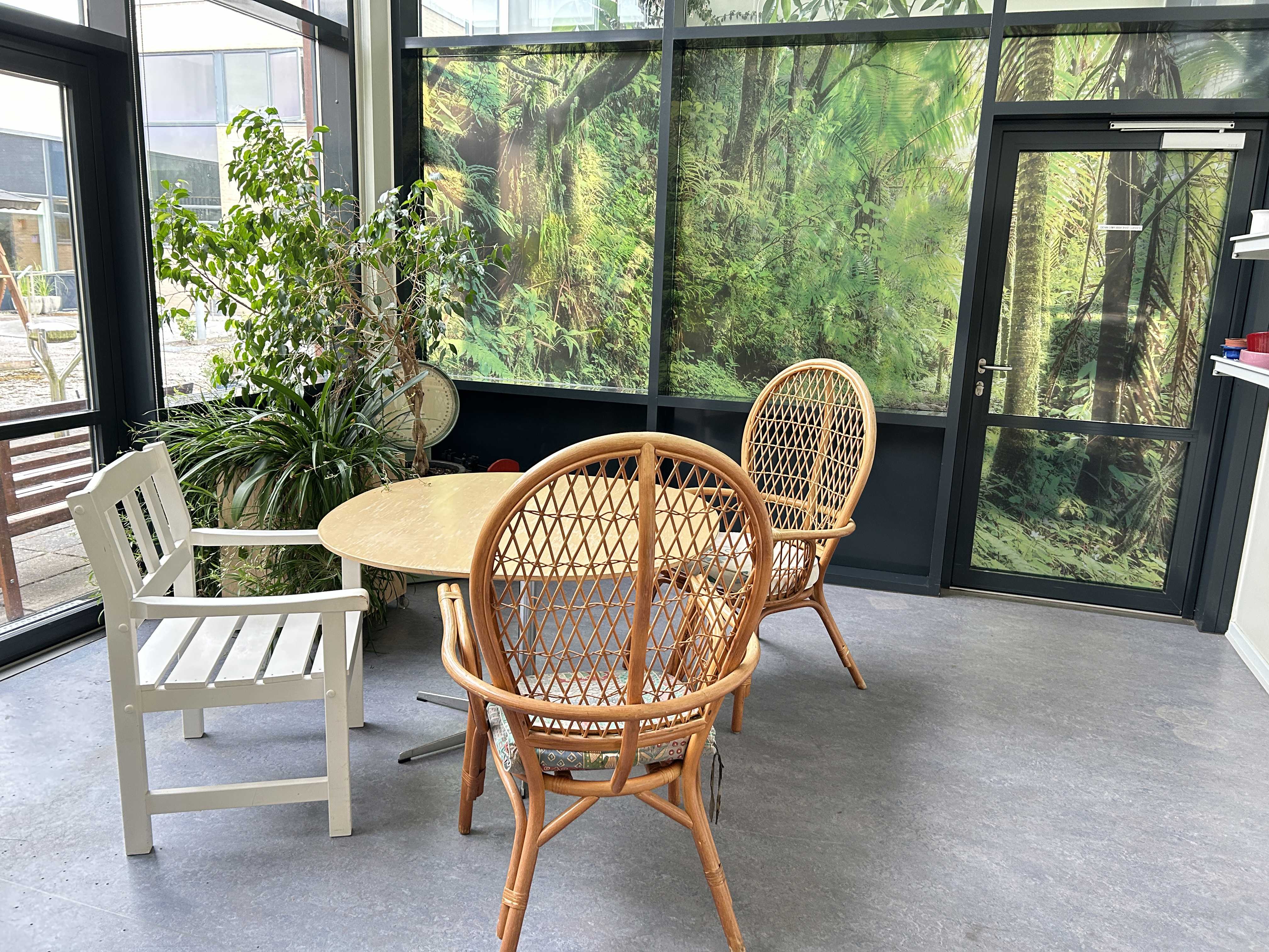 Hovedbygningen er bygget omkring en åben motionsgård og rummer bl.a. kontorer, café, medierum og to gæsteboliger for pårørende. Udenfor findes gårdhavemiljøer, campingvogn, drivhus, petanquebane og meget mere.
