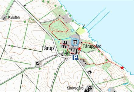 Der er adgang fra en P-plads foran gården. Her er opsat en informationstavle - se den her, der viser de 2 afmærkede vandreruter.